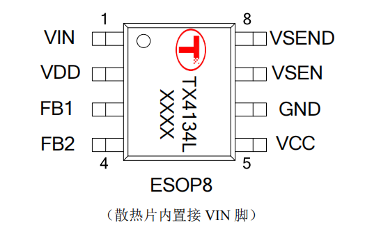 TX4134L 采用 ESOP8 封装,散热片内置接 VIN 脚。