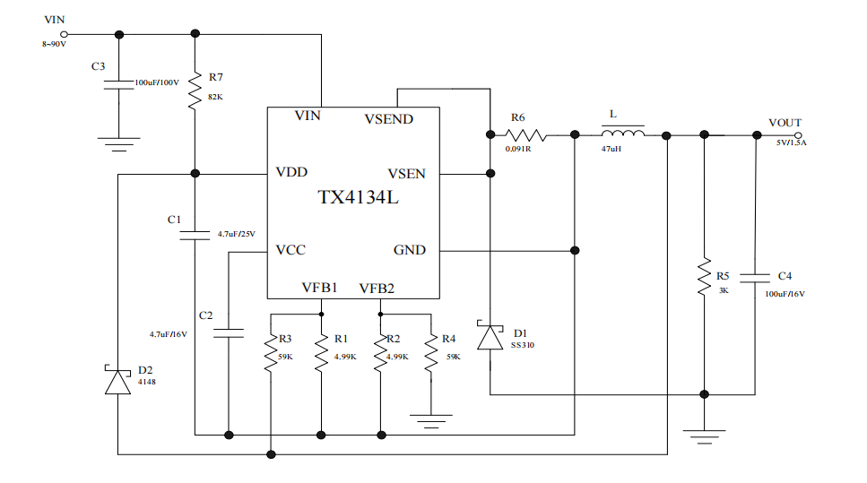 TX4134L 是一款支持宽电压输入的开关降压型DC-DC芯片, 芯片内置 100V/2A功率 MOS, 最高输入电压 90V。