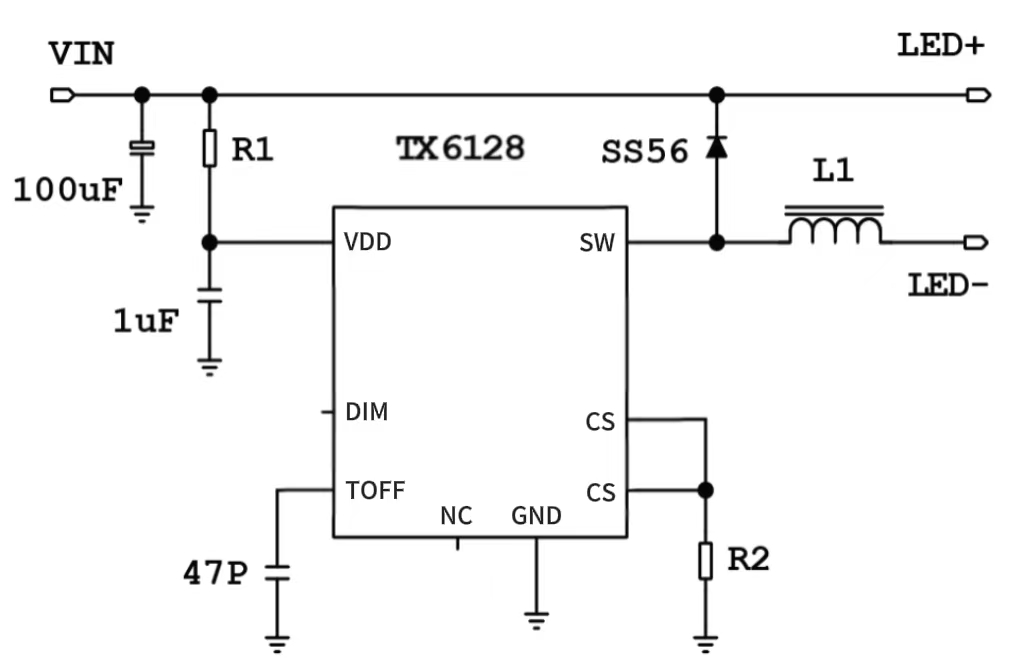 TX6128内置100V功率 MOS 芯片采用固定关断时间的峰值电流控制方式,关断时间可通过外部电容进行调节,工作频率可根据用户要求而改变。