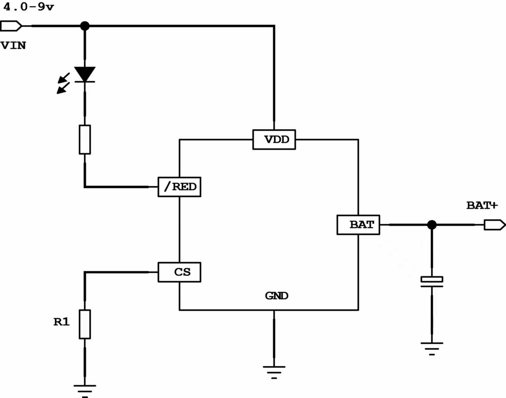 充电电压固定于 4.2V, 而充电电流可通过一个电阻器进行外部设置。